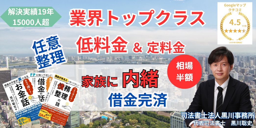 司法書士法人黒川事務所は、債務整理(任意整理・時効援用)などを専門に扱う司法書士事務所です。これまでに19年以上の実績があり15,000人以上を解決に導きました。