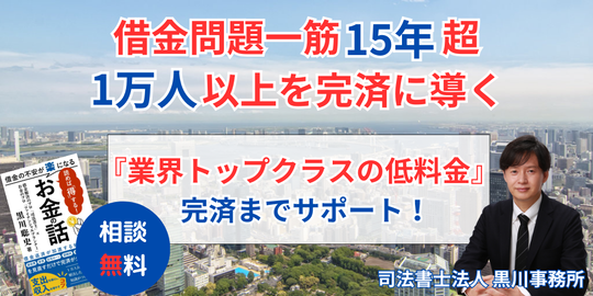 司法書士法人黒川事務所は、債務整理(任意整理・時効援用)などを専門に扱う司法書士事務所です。これまでに18年以上の実績があり12,000人以上を解決に導きました。