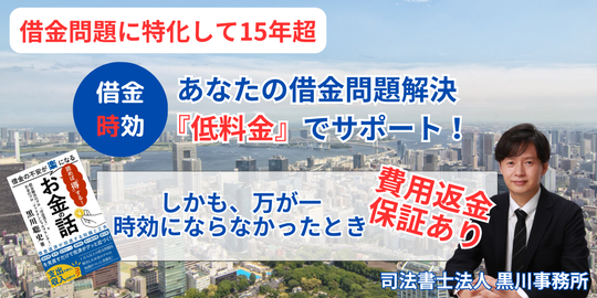 司法書士法人黒川事務所は、債務整理(任意整理・時効援用)などを専門に扱う司法書士事務所です。これまでに18年以上の実績があり12,000人以上を解決に導きました。